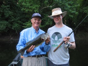 We caught most of the 21 bass by “dipping and dunking”, a technique Richard has developed for fishing in Beaverdam with a worm. He uses a worm with a paddle tail or a Paca Craw with a light weight. With a spinning rod he flips it to the trees and swims the worm back without it dragging on the bottom. We caught some close to the boat just “doodlesocking” it around the trees. The water there is not very clear and a result is the fish are not afraid of the boat. If they hit it and miss, they will hit it again most of the time if they don’t feel the hook. A few were caught on a Ribbit frog. Richard looked in the door of one of the duck blinds and saw an otter peering out at us. It bailed out and swam to a nearby log where it had its photo taken.