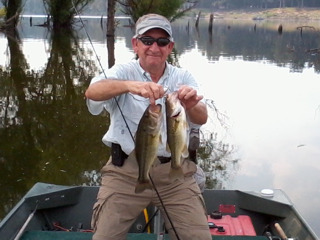 Jackson beat that feat. He made a cast and his line snapped with a Red Eye on and a long piece of line attached. An hour and a half later I hung the line and we pulled in the bait which had two bass on it.