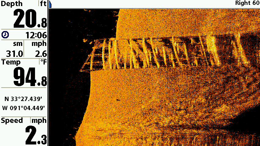 The wind was out of the North and the sky was clear this morning as Jackson and I set out on Lake Chicot. We headed back to the same old places where we have been catching fish but they were not very fired up about feeding. We caught a few small ones on the usual suspects, Yozuri, Red Eye Shad, and various small shallow running crankbaits. When we had exhausted all of our spots, we went over to the deep side and ran the side scan depthfinder to see if there was any structure out from the docks and close to the drop off. The side scan is pretty hard to see in the boat with the glare from the sun so I saved some on the SD card to bring home and look at on the computer screen. Here are two from the deep side.