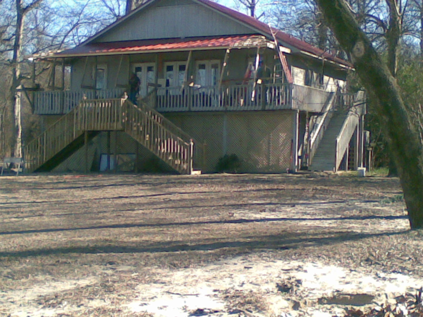 The flood floated off the rear stairs, almost the side stairs, reached the ceiling of the downstairs, got a foot deep upstairs, and floated the garage into the trees destroying it. The downstairs has been demolished, the house has been raised and the supporting piers are the next step. Here is where we are now.