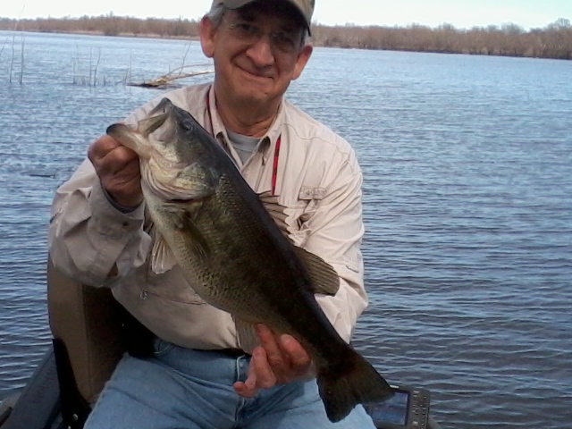 Since Hal and were reliving some good old times we visited the private hole Tuesday. We fished there when we were in high school. As per usual he had all his baits tied on before we got there and he caught one on the second cast before I got the first bait tied on. He was using a KVD 1.5 squarebill crankbait and I was using a Netbait swimbait on a jighead. Things were slow for a while until we hit a spot where the fish wanted the swimbait and I caught several in succession. It was his turn to quickly change baits. We had a good pattern that was working but only a few places that it would fit. I ran out of the Netbait swimbait and tried three other kinds, only one of which was almost as good as the Netbait one. My jigheads are the problem because of the barbs they use to hold the swimbait to the jighead. The barbs tear a hole in the bait after a couple of fish. I even tried to super glue a swimbait to the head. It worked a while but finally came loose after a fish or two. Some fish were caught on a worm or a spinnerbait but the swimbait was the champ. Hal is a true conservationist. He doesn’t kill snakes and tried to discourage me from “sedating” the two bowfin (grinners) I caught. I noticed his disdain when I cracked them in the head with my cut off hoe handle. The alligators were out today in force with three showing up, two little and one big. The big one did a good job of showing itself. Our guesstimate for its length was 10 feet long. We caught 37 bass with a FOD of 4-3. In the last four days 159 bass have made into the boat that I have been fishing in, and it’s been great, but now back to reality, for only a short time I hope.