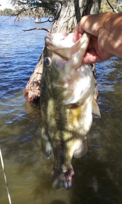 We left early when the lake was smooth and headed to the island spot, where again, we caught only one or two. Boosted  by our success  in finding a new spot the previous day, we pulled out the map and went cove hopping. While in one particularly deep cove we noticed the wind was picking up so we made a break for the spot we found the day before. After a rough ride we found the fish in residence again, and again, we started to catch some. Hal caught the FOD that was 3 1/4. As we fished we kept an eye out on the waves on the river. Unbelievably the wind and waves started to subside and allowed us a smooth ride to the J.P. Coleman state park. We went to the back of Indian Creek which is the large cove right by the park. In the back of that cove, we found the gulls circling and going down to get shad while the fish were hitting them from below. There was one boat chasing the bass when they surfaced, another sitting in one place all afternoon, and then us. We went to the grass in the back of the cove and pulled out our Ribbits. A few bit the Ribbits but it was obvious the schoolers were the game to play. We fished until dark and ended up with 33 for the day.
