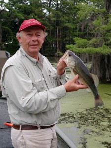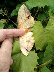 This morning early I went to the private hole for the first time since the river got in and added 10 to 12 feet of water to it. It looked beautiful with lots of duckweed and water with at least 40 inch visibility. The duckweed was in the middle of the hole as well as around the sides. I have caught them before hanging under the pieces floating out in the middle so optimism was high. The condition was perfect for a Ribbit frog. I went a long time without a bite from a bass. Finally in a shallow spot with some weeds and some duckweed I caught one small one. Some of the weeds were under the water and the ones 6 feet deep or less were covered with spirogyra, that slimy green moss. The clear water probably allowed enough light to penetrate to let the moss grow. It was a pain to try to fish anything that went underwater. I stayed with the frog and caught two more, another small one and one about 2 1/2. Â It was hard for me to figure out what the game was today. I am quite familiar with that hole and know many of the good places to fish but was stymied today. The baits used were shaky head, red eye shad, Rex spoon, and a crank bait that dives to about 8+ feet. No bites on any of those things. The gar, about 18 to 24 inches long, were everywhere. The were eating the cicadas that have hatched this year. There are so many buzzing in the trees you can hardly hear yourself think. There have been so many water rescues on television, I didn’t want to be left out so I made one today. I saw this pretty io moth in the water struggling to get up on something dry. It was actually tangled up in some spirogyra and never would have been able to climb out onto something dry. I went over and pulled it out, cleaned it off and placed it on a leaf. Not sure it will survive but at least it was not lunch for one of the gar. Picture below. Disappointed, I quit early.